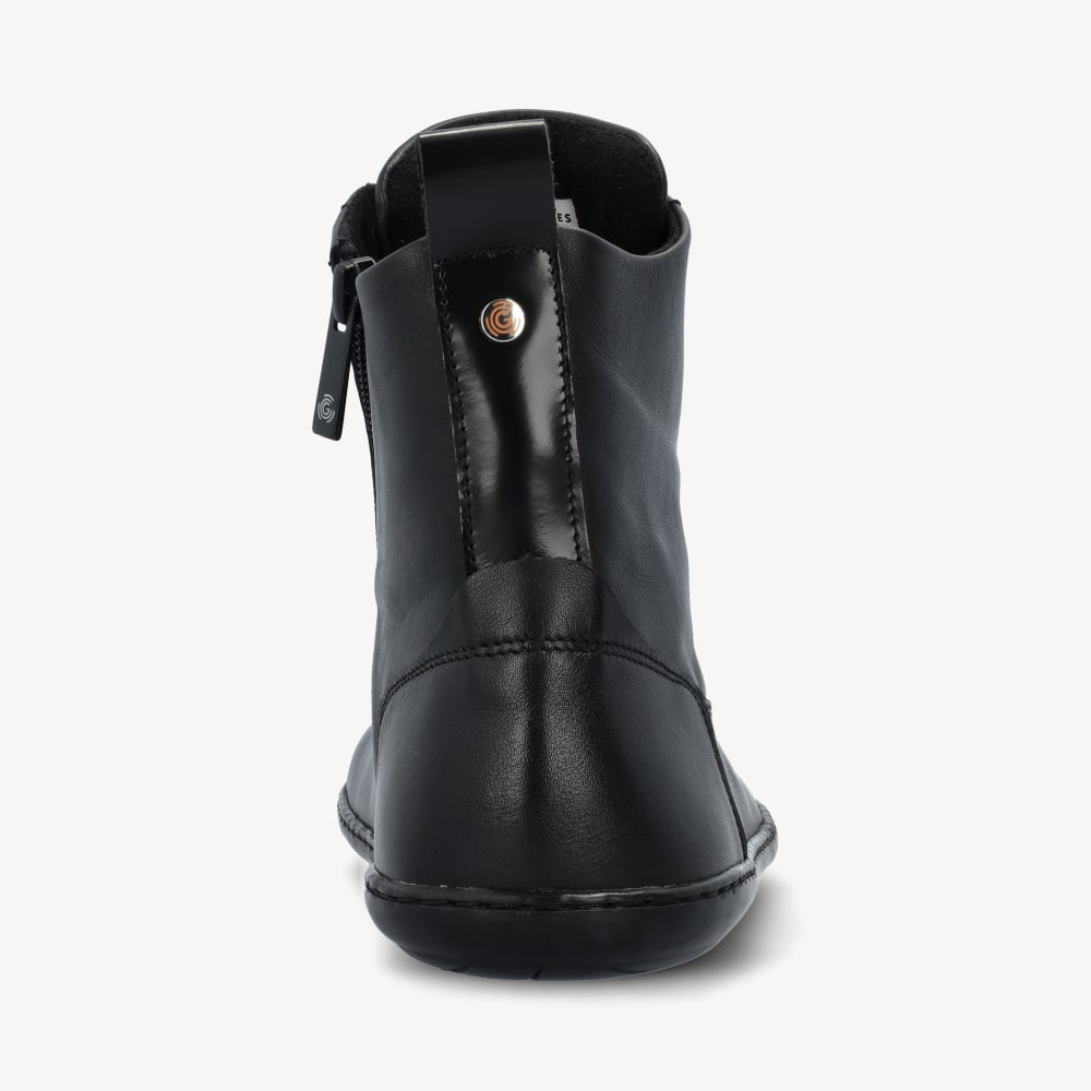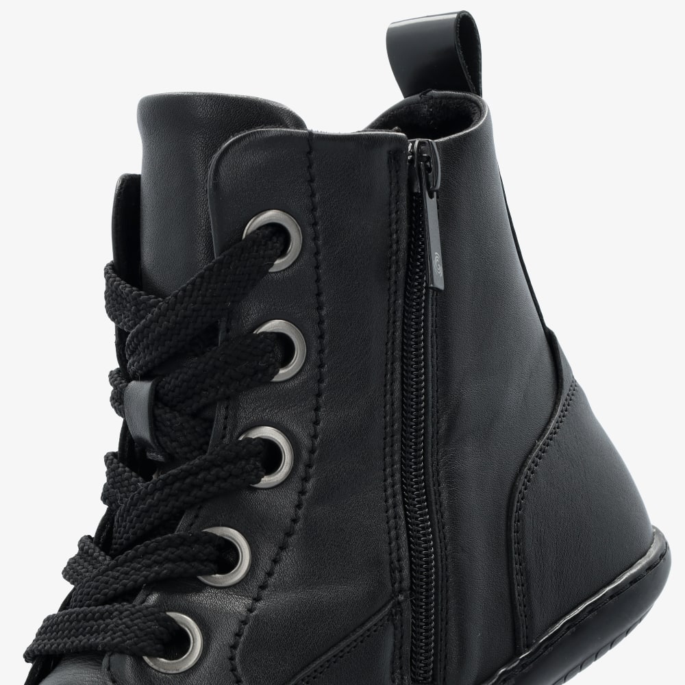 Ovandel: Ovandel i svart läder med stora oxiderade metallöljetter och breda, flata skosnören. Snörning och dragkedja. Mjuk fodring inuti hela kängan av sammetsliknande textil och mikrofiber. Draghank i blankt material överst på skaftet baktill underlättar påtagning. Snörningen gör att du kan ställa in passformen perfekt, och dragkedjan i skaftet vid insidan av benet gör det snabbt och enkelt att ta på och av kängan.