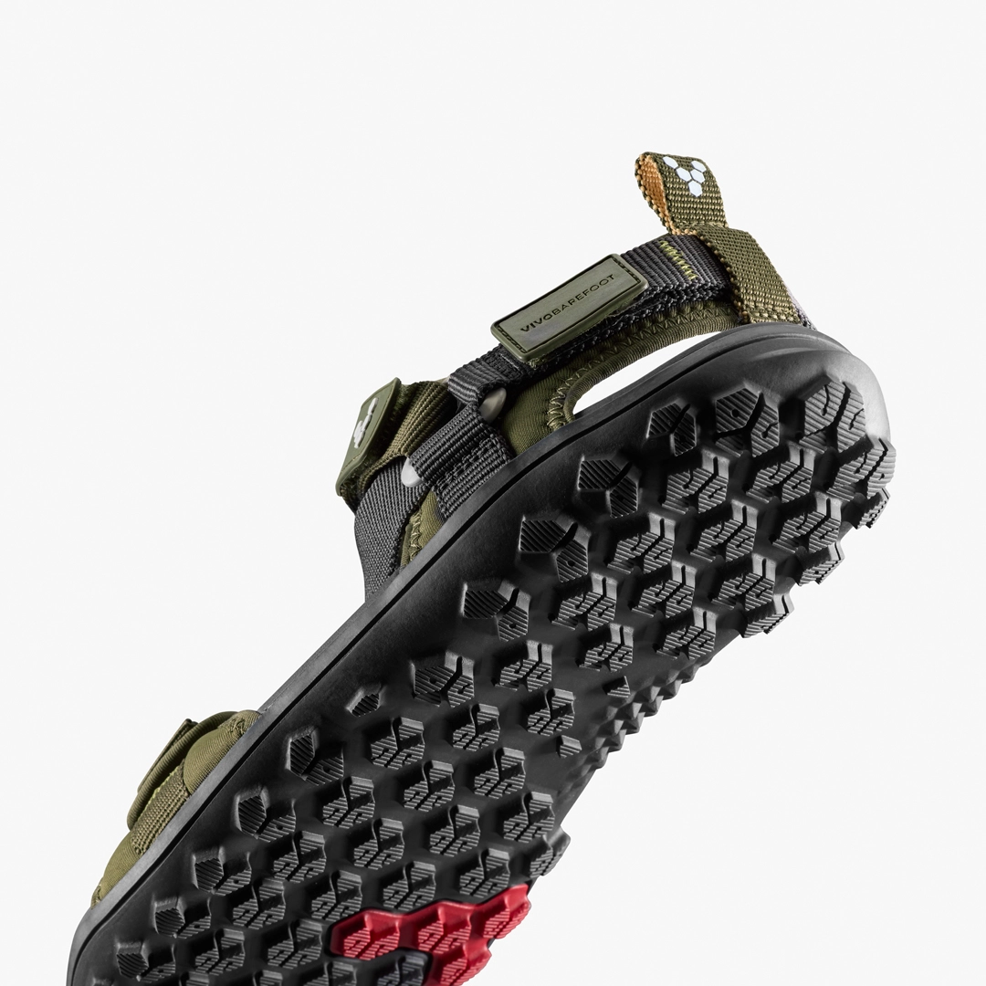 Ovandel: En kombination av stretchig, mjuk och lätt paddad neoprene i återvunnen polyesterväv. Trippelkardborrband för en perfekt passform. En justerbar textilrem som löper genom 3 öglor i benvitt bildar ett Z över fotryggen och knäpps med ett kardborrefäste mot fotens utsida. Justerbar hälrem med kardborrefäste. Justerbar med kardborrefäste över främre trampdynan. Fastsydd hank på hälkappan för enklare påtagning. Neoprene och nylonremmar i mörkt olivgrönt. Loggan i vitt på kardborreknäppet över vristen.